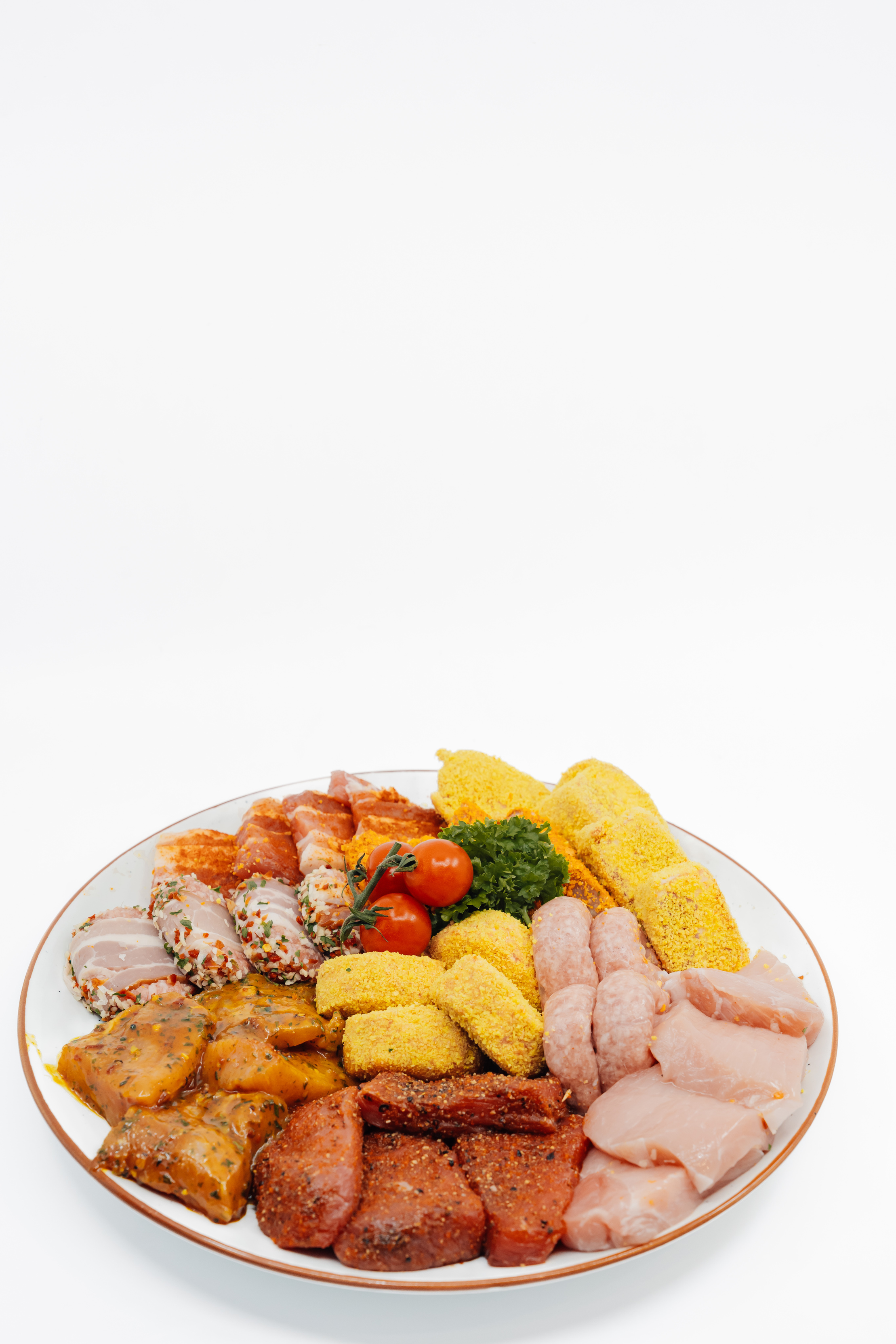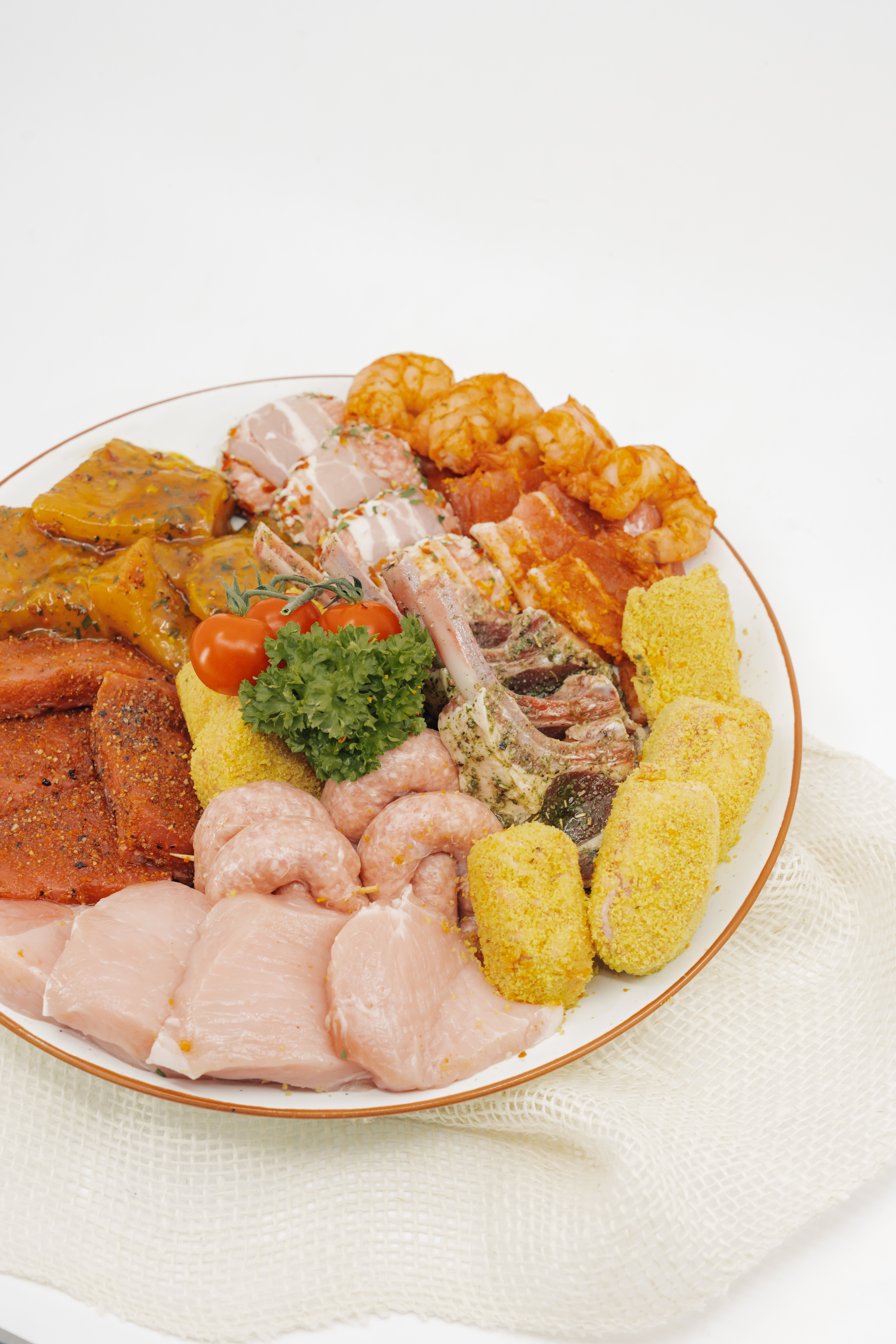 Scampi, Biefstuk, Kalkoenlapje, Lamskroontje, Cordon bleu, Kalfslapje, Chipolata, Kaashamburger, Gekruid spek