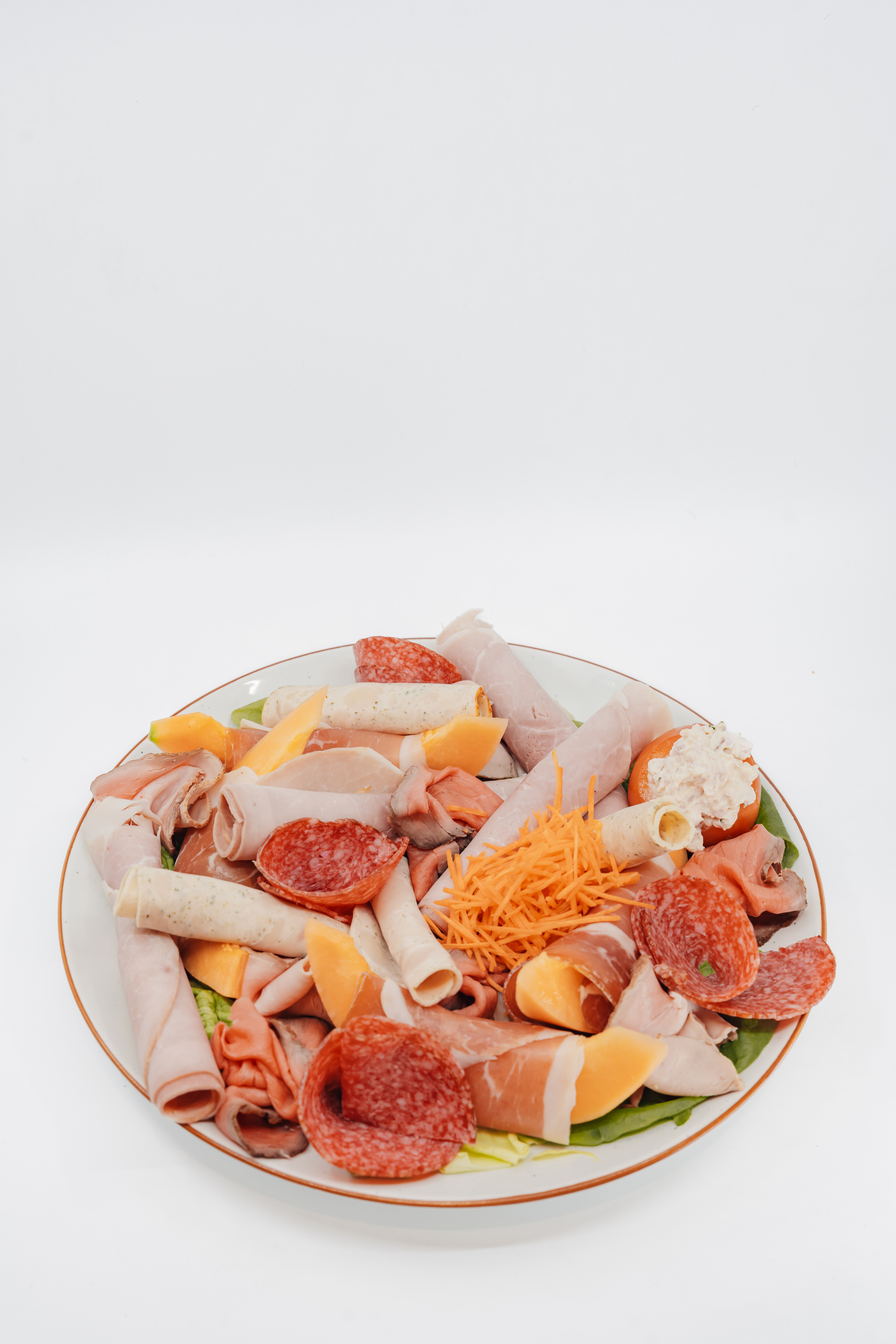Gekookte hesp, Gerookte bacon, Salami, Gebakken Roti, Gerookte ham met meloen, Kippenwit met tuinkruiden, Rosbief, Tomaat gevuld met Vleessalade. Assortiment koude sauzen, koude groentjes & aardappelbereiding inbegrepen.